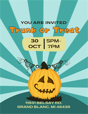 Come join us for Trunk or Treat at Medilodge of Grand Blanc from 5pm to 7pm. Address is 11941Belsay Rd. Grand Blanc, MI 48439.